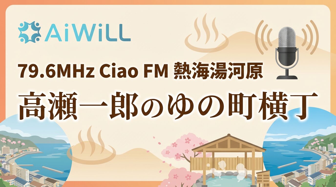 熱海・湯河原エリアを中心に地域に密着した情報をお届けする『高瀬一郎のゆの町横丁』。今回の放送では、AiWiLLの取り組みや活動内容について、パーソナリティの高瀬一郎氏との対談形式でお話しさせていただきます。