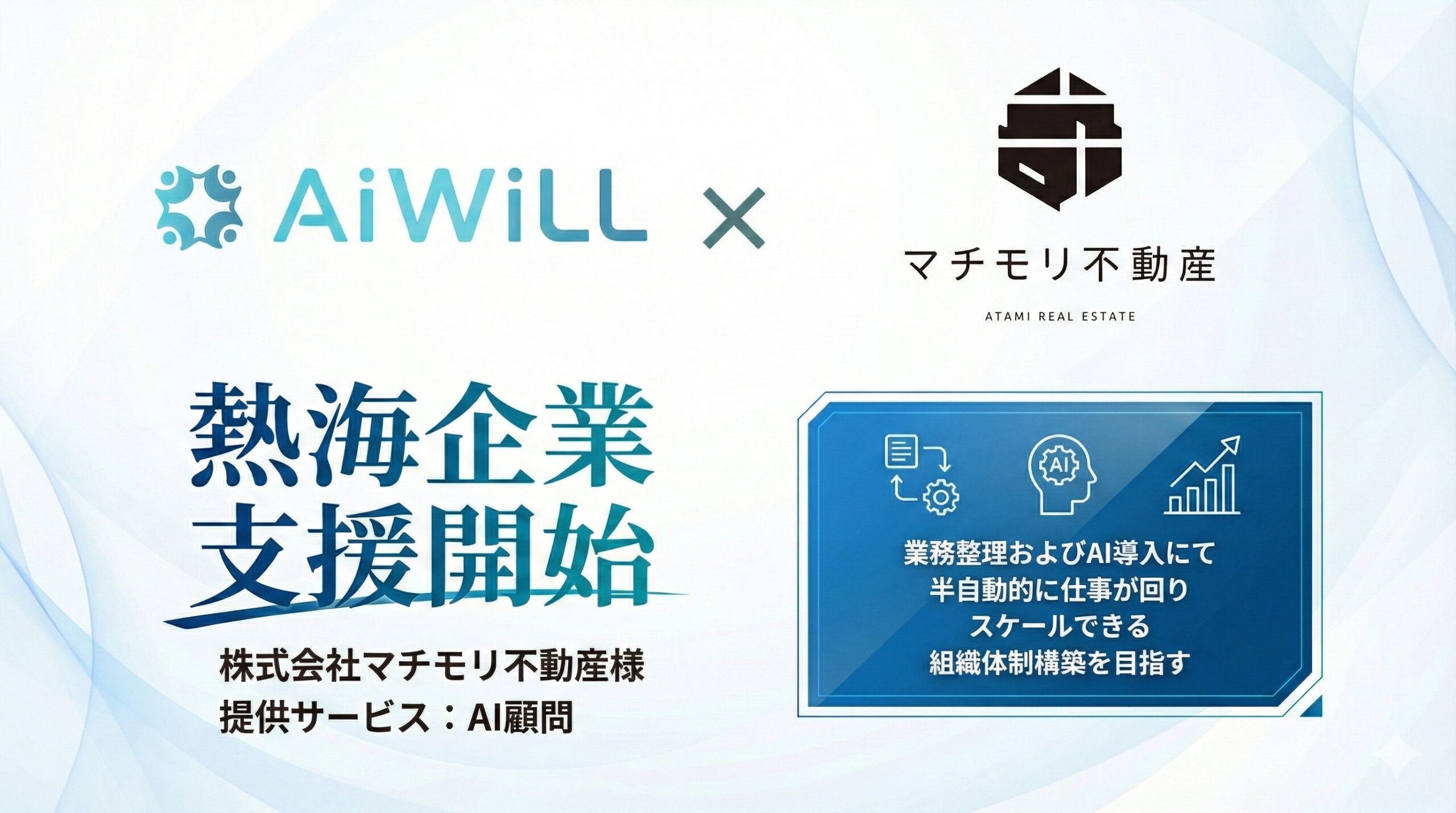 【支援開始】熱海企業の株式会社マチモリ不動産様のAI導入支援を開始いたしました。 2025 12/25 プレスリリース 2025年12月1日2025年12月25日 プレスリリース よかったらシェアしてね! URLをコピーしました! URLをコピーしました! 【開催報告】2025/11/19 AiWiLL × naedoco「面倒な「あの仕事」「連絡や資料作成」が秒で終わるGoogle Workspaceを超活用したGemini実践ワークショップ」開催レポート AiWiLL が 熱海新聞・伊豆毎日新聞・伊豆新聞デジタルに掲載されました 関連記事 【開催報告】2025/11/30 – 熱海・今宮神社でAIアートワークショップ「AI YATAI」を実施しました。 2025年12月5日 AiWiLL が 熱海新聞・伊豆毎日新聞・伊豆新聞デジタルに掲載されました 2025年12月3日 【開催報告】2025/11/19 AiWiLL × naedoco「面倒な「あの仕事」「連絡や資料作成」が秒で終わるGoogle Workspaceを超活用したGemini実践ワークショップ」開催レポート 2025年11月28日 【開催報告】2025/10/17 AiWiLL × naedoco 「毎日の仕事と暮らしが確実に変わる生成AI活用術〜生成AI活用の“土台”を固める入門編〜」AIセミナーを実施しました。 2025年10月23日 【支援開始】熱海企業の株式会社ウェックス様のAI導入支援を開始いたしました。 2025年10月1日 【支援実施報告】株式会社Felo様のアンバサダーイベント運営支援を実施いたしました。 2025年8月15日 【開催報告】2025/7/11 – 公益財団法人江東区文化コミュニティ財団 江東区亀戸文化センターにて「AI(人工知能)を使いこなそう!」のセミナーを実施いたしました。 2025年7月12日 コメント コメントする コメントをキャンセルコメント ※ 名前 ※ メール ※ サイト 次回のコメントで使用するためブラウザーに自分の名前、メールアドレス、サイトを保存する。 Δ