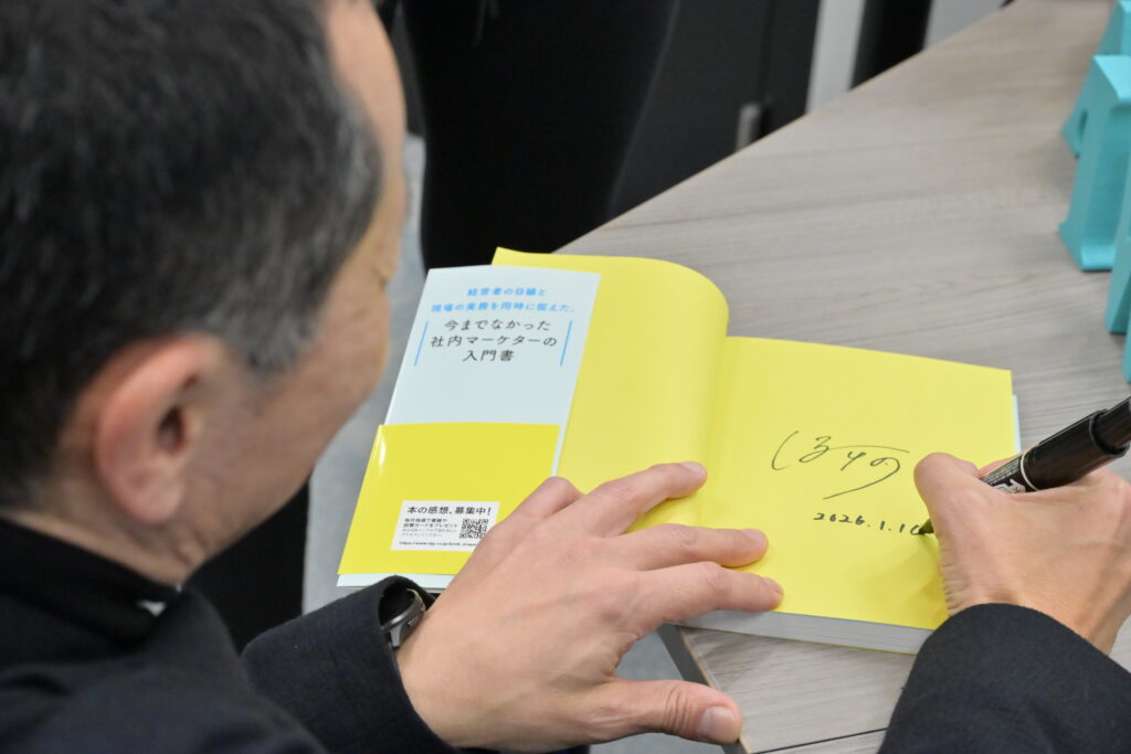 「明日からの一歩」を後押しする直筆サインをする堀野氏