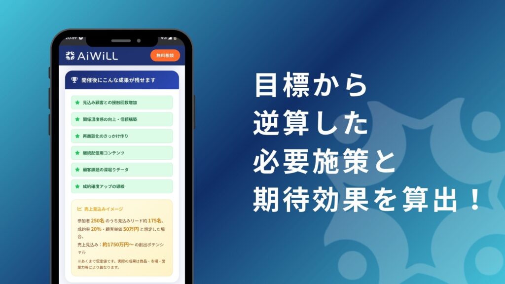 1日のイベントを半永久的なビジネス資産に変え、投資対効果を最大化するマーケティング特化型イベント制作サービス「WiLLCREW(ウィルクル)」を提供するAiWiLL株式会社(代表:赤堀、熱海市)は、2026年04月01日、同社にイベント制作を依頼した場合のコスト・期待効果をシミュレーションできる無料Webアプリ「イベントシミュレーター WiLLMIRU(ウィルミル)」を公開しました。