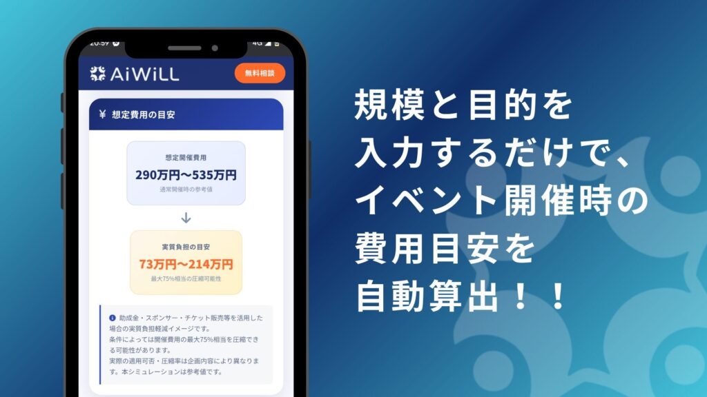 ・イベント規模(参加人数・形式・目的)を入力するだけで、AiWiLL依頼時の費用目安を自動算出